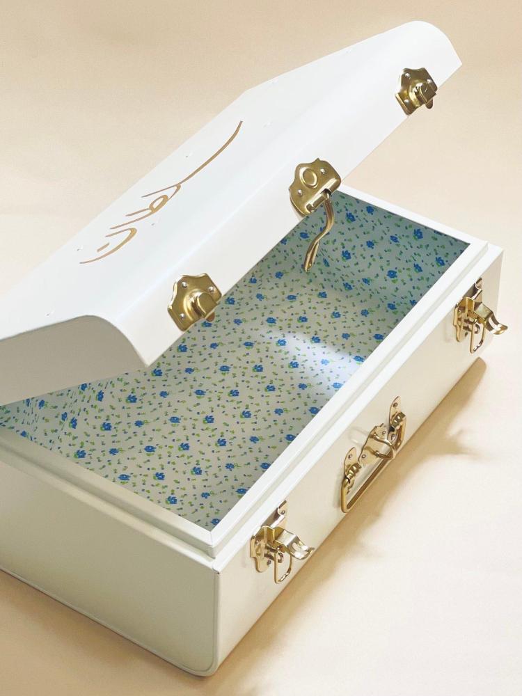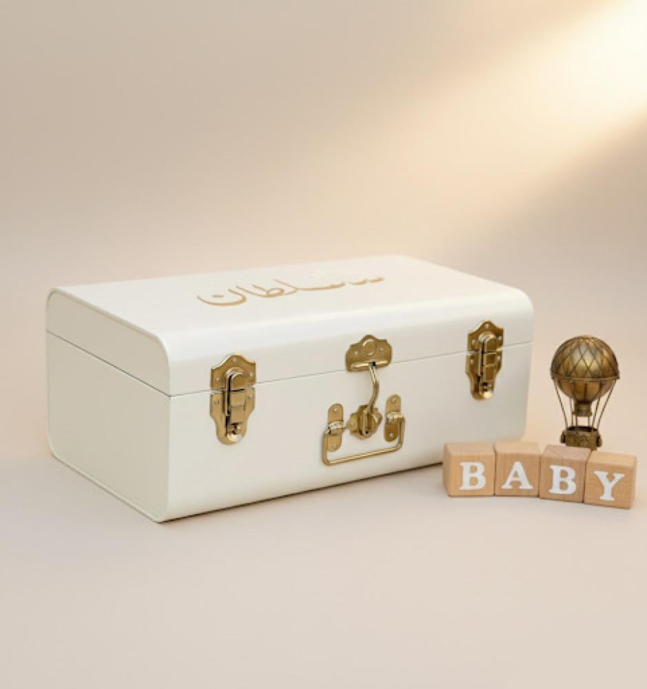 يأتي الصندوق بتصميم كلاسيكي فاخر مصنوع من الحديد بلون البيج الهادئ ولمسة الأقفال الذهبية الأنيقة، ومبطن بالقماش من الداخل ليحفظ الذكريات بكل رقة وأناقة. يمكن تخصيص الصندوق باسم المولود باللون الذهبي، مما يجعله قطعة شخصية فريدة تُحفظ مدى الحياة.