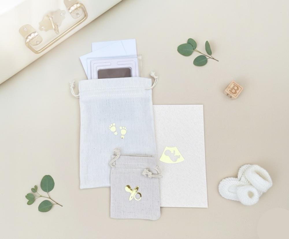 - حقيبة قماشية تحتوي على حبر وبطاقتين لطباعة قدم المولود.